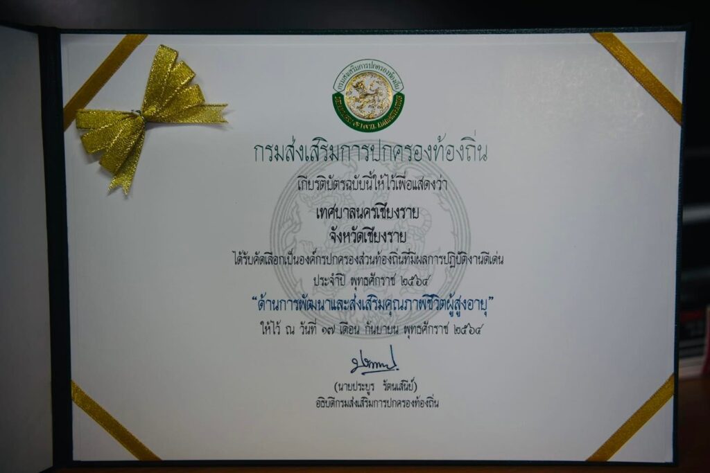ในการนี้ กรมส่งเสริมการปกครองได้คัดเลือกเทศบาลนครเชียงราย “ด้านการพัฒนาและส่งเสริมคุณภาพชีวิตผู้สูงอายุ” ผลงาน : โครงการมหาวิทยาลัยวัยที่สามนครเชียงรายองค์กรปกครองส่วนท้องถิ่นที่มีผลการปฎิบัติงานดีเด่น ระดับจังหวัด ประจำปี 2564