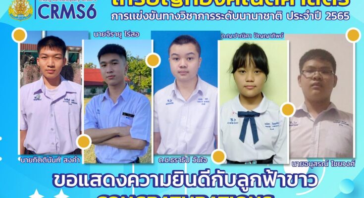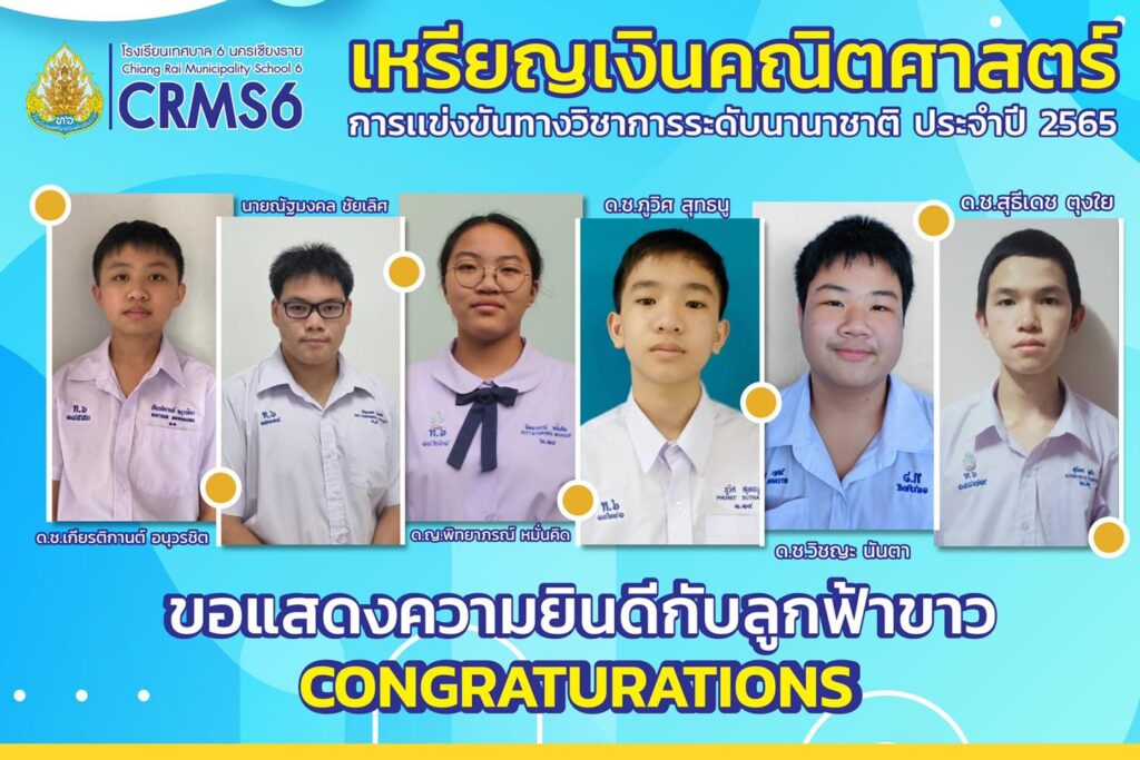 วันพฤหัสบดีที่ 5 พฤษภาคม พ.ศ. 2565 เทศบาลนครเชียงราย โดยนายวันชัย จงสุทธานามณี นายกเทศมนตรีนครเชียงราย ขอร่วมเเสดงความยินดีกับนักเรียนระดับชั้นมัธยมศึกษาตอนต้น โรงเรียนเทศบาล 6 นครเชียงราย เข้าร่วมเเข่งขันทางวิชาการ ระดับนานาชาติ ประจำปี 2565 รอบระดับเขตพื้นที่ ในรายวิชาคณิตศาสตร์ ระดับชั้นมัธยมศึกษาตอนต้น