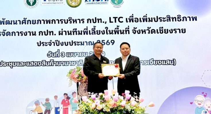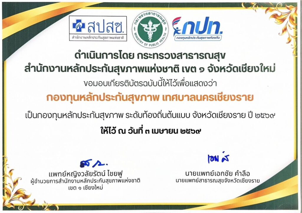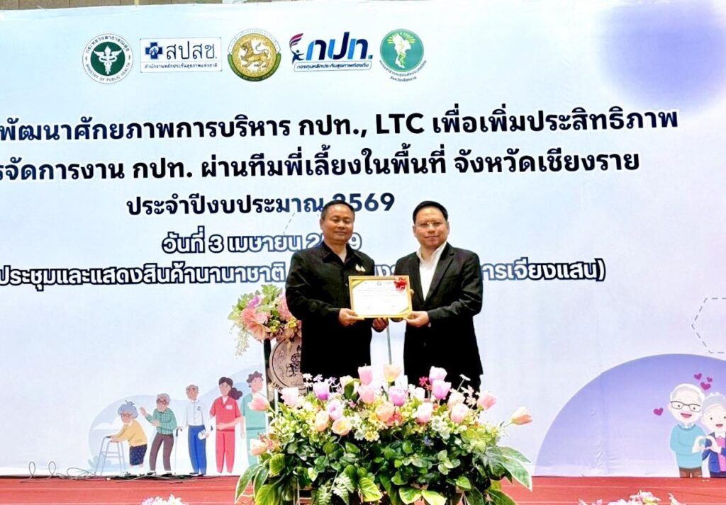 เทศบาลนครเชียงราย นายวันชัย จงสุทธานามณี นายกเทศมนตรีนครเชียงราย ได้มอบหมายให้ นายจตุรัฐชัย จินตนาสิทธิคุณ รองปลัดเทศบาลนครเชียงราย รักษาราชการเเทนปลัดเทศบาลนครเชียงราย รับมอบเกียรติบัตร กองทุนหลักประกันสุขภาพ ระดับท้องถิ่นต้นแบบ จังหวัดเชียงราย ปี 2569 ในเวทีการประชุมพัฒนาศักยภาพการบริหาร กปท. LTC ผ่านทีมพี่เลี้ยงในพื้นที่จังหวัดเชียงราย ประจำปีงบประมาณ 2569 โดยได้รับเกียรติจาก นายรุจติศักดิ์ รังษี รองผู้ว่าราชการจังหวัดเชียงราย เป็นประธานในพิธี