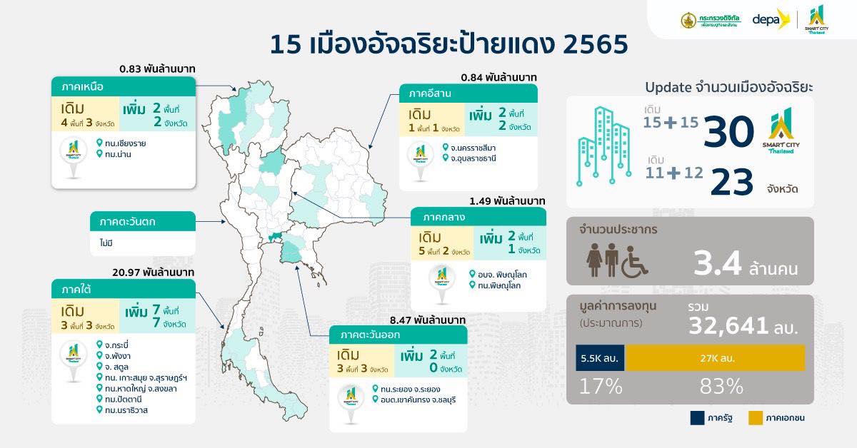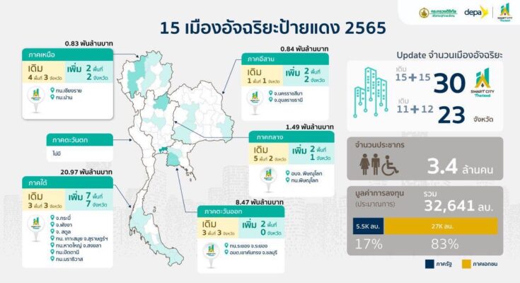 เทศบาลนครเชียงราย โดยนายวันชัยจงสุทธานามณี นายกเทศมนตรีนครเชียงราย กล่าวว่า เมื่อวันนี้ 5 สิงหาคม 2565 นายชัยวุฒิ ธนาคมานุสรณ์ รัฐมนตรีว่าการกระทรวงดิจิทัลเพือเศรษฐกิจและสังคม (ดีอีเอส) นางสาวอัจฉรินทร์ พัฒนพันธ์ชัย ปลัดกระทรวงดิจิทัลฯ ผู้ทรงคุณวุฒิในแต่ละด้าน ผู้แทนจากกระทรวงและหน่วยงานต่าง ๆ ที่เกี่ยวข้อง รวมถึงผู้เชี่ยวชาญที่มีบทบาทสำคัญในการพัฒนาเมืองอัจฉริยะ พร้อมด้วย ผศ.ดร.ณัฐพล นิมมานพัชรินทร์ ผู้อำนวยการใหญ่ สำนักงานส่งเสริมเศรษฐกิจดิจิทัล หรือ ดีป้า ในฐานะเลขานุการคณะอนุกรรมการฯ ร่วมพิจารณาข้อเสนอ และเห็นชอบแผนพัฒนาเมืองอัจฉริยะ จำนวน 15 พื้นที่ ใน 14 จังหวัด ประกอบด้วย 1. นครระยองเมืองอัจฉริยะและน่าอยู่ จังหวัดระยอง 2. คันทรงโมเดล เมืองแห่งความสุขที่พึงประสงค์และสังคมแห่งการแบ่งปัน จังหวัดชลบุรี 3. การพัฒนาเมืองอัจฉริยะของพื้นที่ในจังหวัดพิษณุโลก จังหวัดพิษณุโลก4. โครงการพิษณุโลกนครอัจฉริยะอย่างยั่งยืน จังหวัดพิษณุโลก5. #นครเชียงรายสู่เมืองอัจฉริยะจังหวัดเชียงราย6. เมืองน่านสู่เมืองอัจฉริยะ จังหวัดน่าน7. โคราชเมืองอัจฉริยะ จังหวัดนครราชสีมา Smart City8. กระบี่เมืองอัจฉริยะ จังหวัดกระบี่ 9. Smart City อุบลราชธานี จังหวัดอุบลราชธานี10. จังหวัดพังงาสู่เมืองอัจฉริยะ จังหวัดพังงา11. Satun Smart City จังหวัดสตูล12. พัฒนาเทศบาลนครเกาะสมุย สู่เมืองอัจฉริยะอย่างยั่งยืน จังหวัดสุราษฎร์ธานี 13. หาดใหญ่เมืองอัจฉริยะสีเขียว จังหวัดสงขลา14. ปัตตานีเมืองอัจฉริยะ จังหวัดปัตตานี15.เมืองสิ่งแวดล้อมสร้างสรรค์นราธิวาส จังหวัดนราธิวาส ทั้งนี้ ส่งผลให้ประเทศไทยมีพื้นที่ที่ได้รับการรับรองเป็นเมืองอัจฉริยะ รวม 30 พื้นที่ ใน 23 จังหวัด ซึ่งการดำเนินงานเพื่อผลักดันให้เกิดการวางแผนและพัฒนาเมืองอัจฉริยะแสดงให้เห็นถึงการขับเคลื่อนอย่างต่อเนื่องและเริ่มเห็นผลอย่างเป็นรูปธรรม โดยสิ่งที่สำคัญคือ การทำให้ผู้บริหารเมือง ทั้งภาครัฐและภาคเอกชนตระหนักถึงความสำคัญของการสร้างกระบวนการและการพัฒนาเมืองอัจฉริยะที่มุ่งเน้น ‘คน’ เป็นศูนย์กลาง เพื่อให้เกิดแผนการพัฒนาเมืองและโครงการที่ตอบสนองบริบทของพื้นที่ และความต้องการของประชาชน โดยการพัฒนาเมืองอัจฉริยะเดินทางเข้าสู่ช่วงเวลาแห่งการผลักดันการดำเนินโครงการให้เป็นไปตามแผนการ โดยเน้นกระบวนการสร้างความร่วมมือในทุกภาคส่วน อันจะนำมาซึ่งคุณภาพชีวิตที่ดีขึ้นของประชาชน ทั้งด้านสังคม เศรษฐกิจ และสิ่งแวดล้อม.