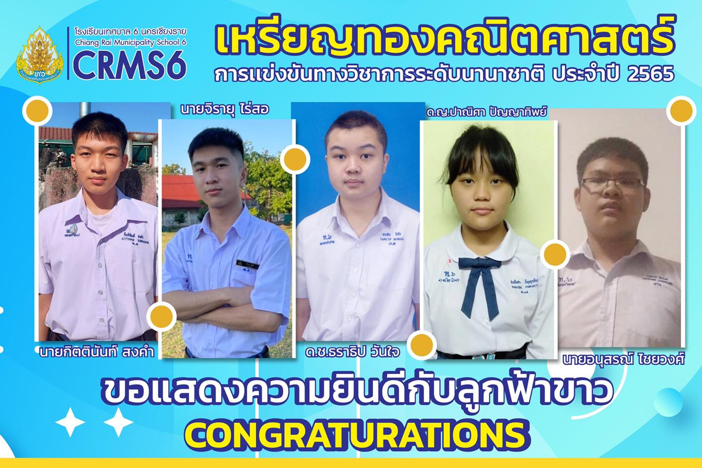 วันพฤหัสบดีที่ 5 พฤษภาคม พ.ศ. 2565 เทศบาลนครเชียงราย โดยนายวันชัย จงสุทธานามณี นายกเทศมนตรีนครเชียงราย ขอร่วมเเสดงความยินดีกับนักเรียนระดับชั้นมัธยมศึกษาตอนต้น โรงเรียนเทศบาล 6 นครเชียงราย เข้าร่วมเเข่งขันทางวิชาการ ระดับนานาชาติ ประจำปี 2565 รอบระดับเขตพื้นที่ ในรายวิชาคณิตศาสตร์ ระดับชั้นมัธยมศึกษาตอนต้น