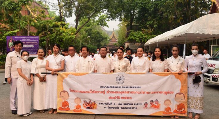 วันเสาร์ที่ 1 เมษายน 2566 เทศบาลนครเชียงราย โดยนายวันชัย จงสุทธานามณี นายกเทศมนตรีนครเชียงราย มอบหมายให้ นายณรงค์ศักดิ์ เตือนสกุล รองนายกเทศมนตรีนครเชียงราย นายสมศักดิ์ เวียงโอสถ ประธานสภาเทศบาลนครเชียงราย สมาชิกสภาเทศบาลนครเชียงราย นางอำไพ จันทร์เงิน ผู้อำนวยการสำนักการศึกษา ข้าราชการและเจ้าหน้าที่เทศบาลนครเชียงราย ร่วมกับวัดพระแก้วเชียงราย พิธีบรรพชาสามเณรภาคฤดูร้อน ประจำปี 2566 โดยได้รับความเมตตาจากพระรัตนมุนี ปุณณมี รองเจ้าอาวาสวัดพระแก้ว ในการจัดบรรพชาสามเณรภาคฤดูร้อน ระหว่างวันที่ 1-10 เมษายน 2566 ณ วัดพระแก้ว อำเภอเมือง จ.เชียงราย การบรรพชาสามเณรเป็นการสร้างพฤติกรรมและสิ่งแวดล้อมใหม่ให้กับเยาวชน หลังลาสิกขาจึงเป็นการปรับพฤติกรรมเด็กให้เข้าสู่วิถีชีวิตที่ดีงาม เป็นลูกที่ดีของพ่อแม่ เป็นศิษย์ที่ดีของครูอาจารย์ เป็นพลเมืองดีของชาติและเกิดพลังสืบสานพระพุทธศาสนาสืบไป.