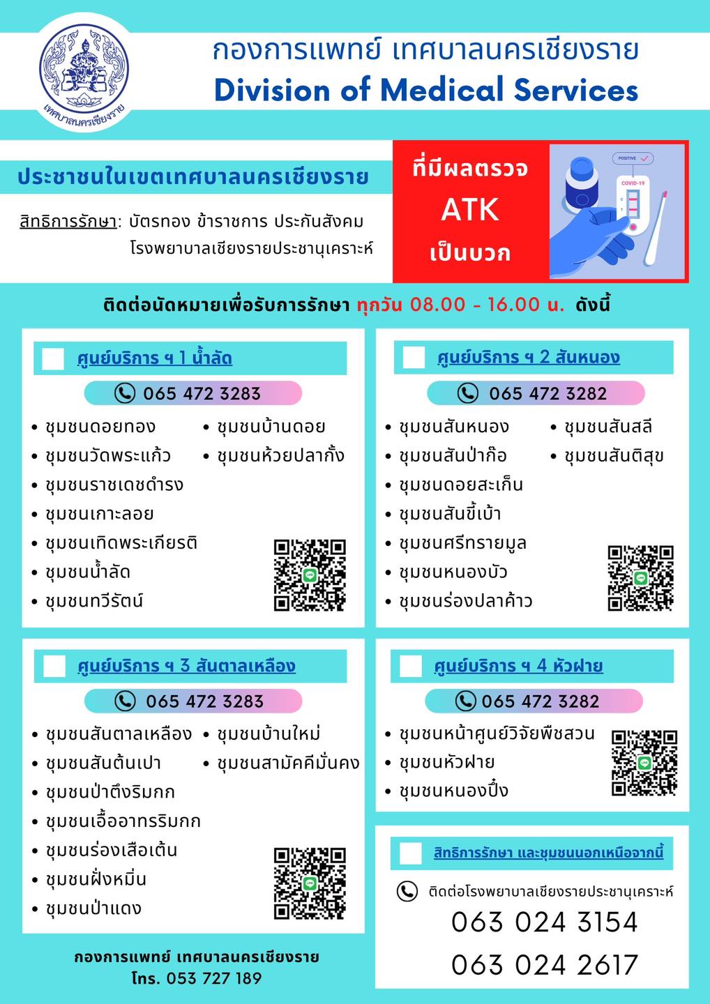 เทศบาลนครเชียงราย โดย นายวันชัยจงสุทธนามณี นายกเทศมนตรีนครเชียงราย มอบหมายให้ นางพรทิพย์ จันทร์ตระกูล รก.ผู้อำนวยการกองการแพทย์ เทศบาลนครเชียงราย ในการให้บริการประชาชนในเขตเทศบาลนครเชียงรายที่มีผลตรวจ ATK เป็นบวกสามารถติดต่อนัดหมาย เพื่อรับการรักษาทุกวัน ตั้งแต่เวลา 08:00 น. – 16:00 น. โดยสามารถใช้สิทธิ์การรักษาบัตรทอง ข้าราชการ ประกันสังคมโรงพยาบาลเชียงรายประชานุเคราะห์โดยจะมีศูนย์บริการ 4 ศูนย์คือ ศูนย์บริการน้ำลัด ศูนย์บริการสันหนอง ศูนย์บริการสันตาลเหลือง และศูนย์บริการหัวฝาย ส่วนบัตรทองประกันสังคมรัฐวิสาหกิจโรงพยาบาลอื่นๆให้ไปรับบริการที่โรงพยาบาลที่ท่านเลือกทั้งนี้ อาการลองโควิด (Long COVID) หรือ Post Covid-19 Syndrome คือ ภาวะของคนที่หายจากโควิด-19 แล้วแต่ยังต้องเผชิญกับอาการที่หลงเหลืออยู่ เชื้อโควิดหายจากร่างกายไปแล้ว อาการลองโควิดจะมีอาการแตกต่างกันไปในแต่ละคน เป็นอาการที่ไม่มีลักษณะตายตัว สามารถเกิดขึ้นได้ทั่วร่างกาย ตั้งแต่ระบบหายใจ ระบบประสาท ระบบทางเดินอาหาร หัวใจและหลอดเลือด ทำให้ผู้ที่หายป่วยบางรายยังไม่สามารถกลับไปใช้ชีวิตได้ปกติเหมือนเดิม ซึ่งอาการลองโควิดมีโอกาสเกิดขึ้นได้ 30-50% จากจำนวนผู้ติดเชื้อโควิด-19 ที่รักษาหายแล้ว โดยเฉพาะผู้ที่มีอาการป่วยรุนแรง.