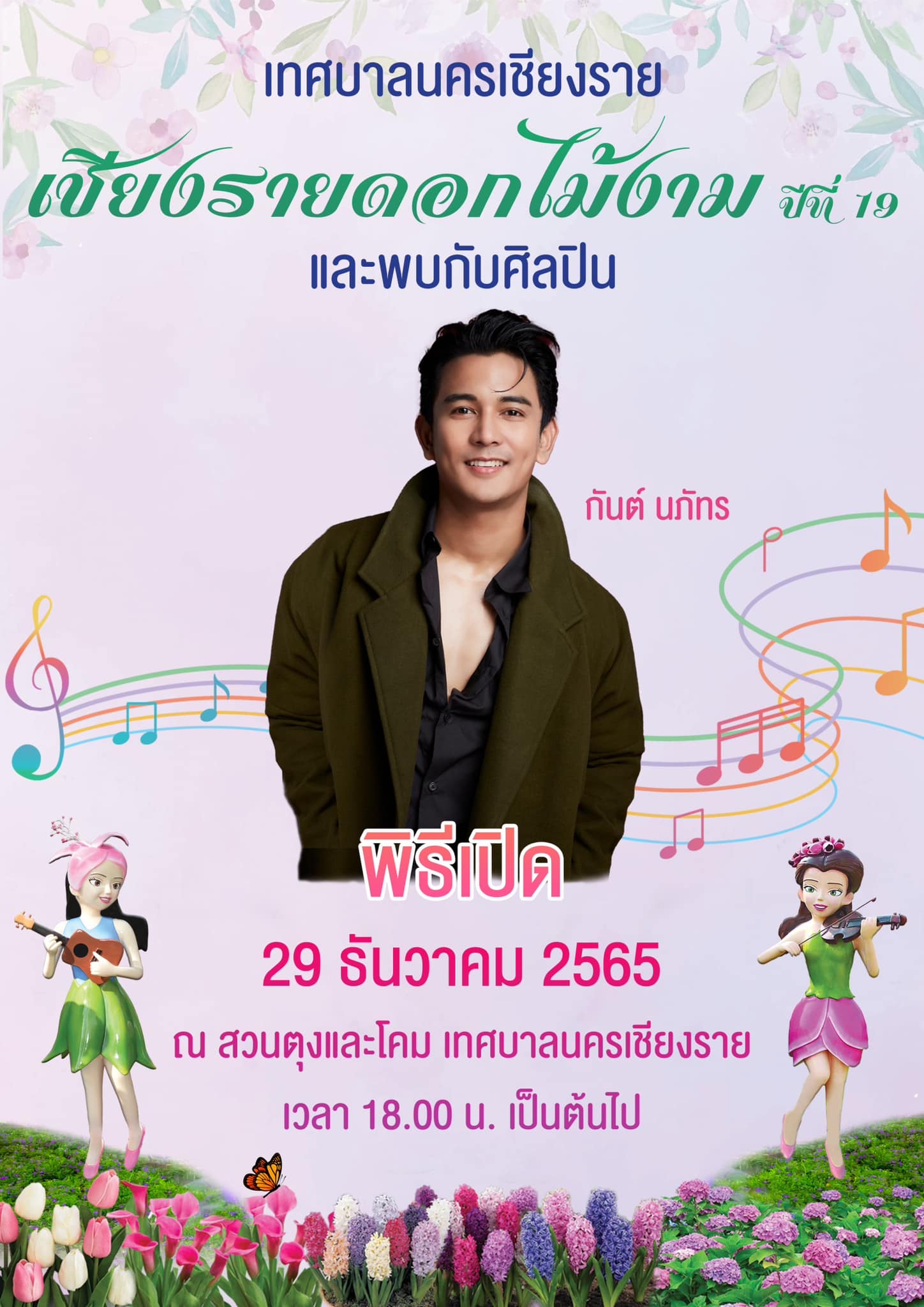 เทศกาลเชียงรายดอกไม้งาม ปีที่ 19 เทศบาลนครเชียงรายโดยนายวันชัย จงสุทธานามณี นายกเทศมนตรีนครเชียงราย ได้รังสรรค์ “เทศกาลเชียงรายดอกไม้งาม” สัญญลักษณ์หนึ่ง เมื่อมาเยือนเชียงรายดอกไม้งามจะพบกับความสวยงามด้วยนวัตกรรม ศิลปะดอกไม้ที่สรรค์สร้างขึ้นมา ให้มีความแตกต่างกันไปทุกๆปี โดยในปีนี้เทศบาลนครเชียงรายรังสรรค์รูปแบบดอกไม้ “จากวันนั้น…สู่วันนี้” #โดยจะมีพิธีเปิดในวันที่29ธันวาคม2565 พบกับศิลปินกันต์ นภัทร วันที่ 30 ธันวาคม 2565 พิธีตักบาตรดอกไม้ หนึ่งเดียวในล้านนา และพบกับวงดนตรีไพเราะในตำนาน เจ้าของบทเพลง “รักฉันนั้นเพพื่อเธอ” พิงค์แพนเตอร์ เทศบาลนครเชียงรานขอเชิญชวนนักท่องเที่ยวและพี่น้องชาวเชียงรายทุกท่านมาร่วมชมความงามดอกไม้ และรับฟังเพลงอันไพเราะท่ามกลางสวนดอกไม้ ณ สวนตุงและโคม เทศบาลนครเชียงราย.