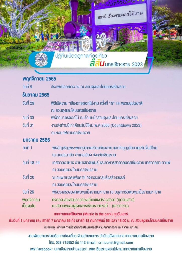เทศบาลนครเชียงราย โดย นายวันชัย จงสุททานามณี นายกเทศมนตรีนครเชียงราย ร่วมกับ ส่วนราชการ ภาคเอกชนจังหวัดเชียงราย  เชิญชวนประชาชน และผู้ประกอบการในจังหวัดเชียงราย เตรียมพร้อม ”ฤดูกาลท่องเที่ยวนครเชียงราย”  จากความสวยงามของดอกไม้ริมแม่น้ำ สู่ ดอกไม้กลางใจเมืองเชียงราย ซึ่งเป็นความท้าทายของ นางรัตนา จงสุทธานามณี นายกสมาคมกีฬาแห่งจังหวัดเชียงราย ที่ได้สานพลังใจ พลังกาย กับ นายวันชัย จงสุทธานามณี นายกเทศมนตรีนครเชียงราย
