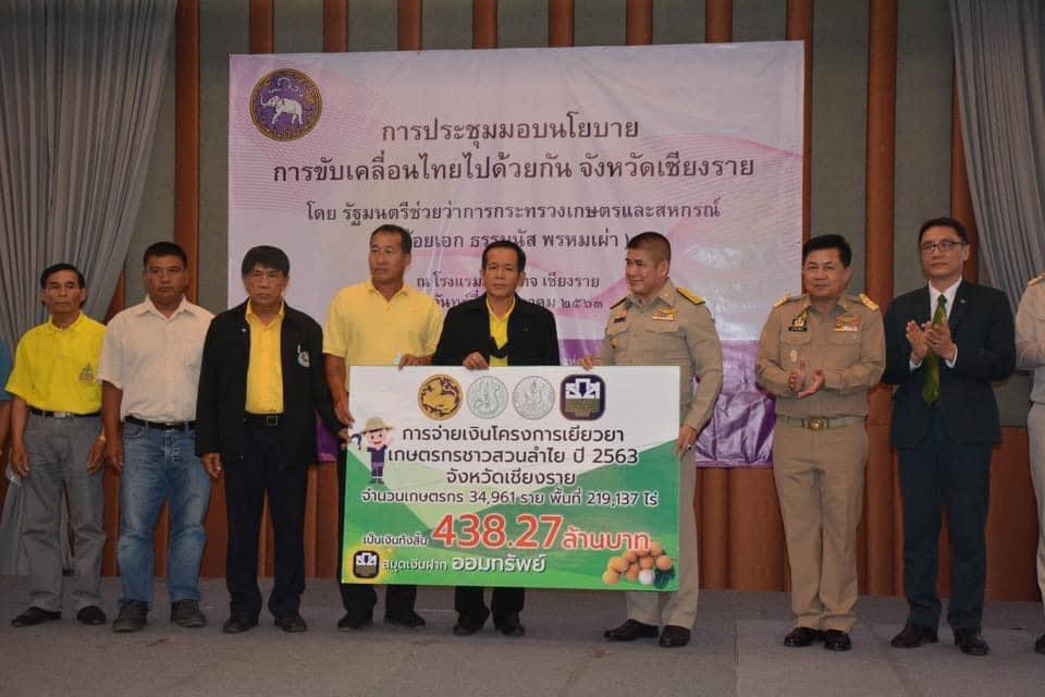 ร้อยเอก ธรรมนัส พรหมเผ่า รัฐมนตรีช่วยว่าการกระทรวงเกษตรและสหกรณ์ เป็นประธานการประชุมมอบนโยบายทิศทางการขับเคลื่อนไทยไปด้วยกันจังหวัดเชียงราย โดยมี นายประจญ ปรัชญ์สกุล ผู้ว่าราชการจังหวัดเชียงราย พร้อมด้วยข้าราชการชั้นผู้ใหญ่ คณะกรรมการขับเคลื่อนไทยไปด้วยกันจังหวัดเชียงราย หัวหน้าส่วนราชการ ผู้บริหารมหาวิทยาลัยแม่ฟ้าหลวง นายอำเภอ ผู้นำท้องที่ ผู้นำท้องถิ่น เกษตรกร ตลอดทั้ง ผู้แทนภาคประชาสังคมและภาคเอกชน สมาชิกสภาเกษตรกรจังหวัดเชียงราย กลุ่มเกษตรกรชาวสวนลำไย รวมทั้ง ผู้เกี่ยวข้องร่วมให้การต้อนรับและรับมอบนโยบาย พร้อมกับให้เกียรติมอบเอกสารการรับเงินช่วยเหลือเกษตรกรชาวสวนของจังหวัดเชียงราย ในโครงการเยียวยาเกษตรกรชาวสวนลำไย 4,961 ราย รวมพื้นที่ 219,137 ไร่ เป็นเงิน 438.27 ล้านบาท ทั้งนี้ ร้อยเอก ธรรมนัส พรหมเผ่า รัฐมนตรีช่วยว่าการกระทรวงเกษตรและสหกรณ์ กล่าวว่า การได้ทำหน้าที่กำกับดูแลนโยบายทิศทางการขับเคลื่อนไทยไปด้วยกัน ตามคำสั่งคณะรัฐมนตรีในการเป็นพี่เลี้ยง ติดตามดูแลและรับมอบนโยบายจากรัฐบาลมาสู่ท้องถิ่น ของตนในพื้นที่จังหวัดพะเยา จังหวัดเชียงราย และจังหวัดหนองบัวลำภู ซึ่งจังหวัดเชียงรายเป็นจังหวัดใหญ่ มีผู้ว่าราชการจังหวัดเป็นผู้บริหารราชการแผ่นดิน ซ่อมแซม ซ่อมสร้าง นำปัญหามาแก้ไขอย่างเป็นระบบแบบบูรณาการ และรับทราบปัญหาอุปสรรคเพื่อนำไปสู่การแก้ไขให้เกิดความยั่งยืน จากปัญหาการแพร่ระบาดของโรคติดเชื้อไวรัสโคโรนา 2019 จึงจำเป็นต้องปรับตัวเอง หากได้รับความร่วมมือจับมือกันจากทุกฝ่ายอย่างเข้มแข็ง อาทิ เช่น อสม. กำนัน ผู้ใหญ่บ้าน และทุกฝ่ายให้ผ่านวิกฤตไปได้.